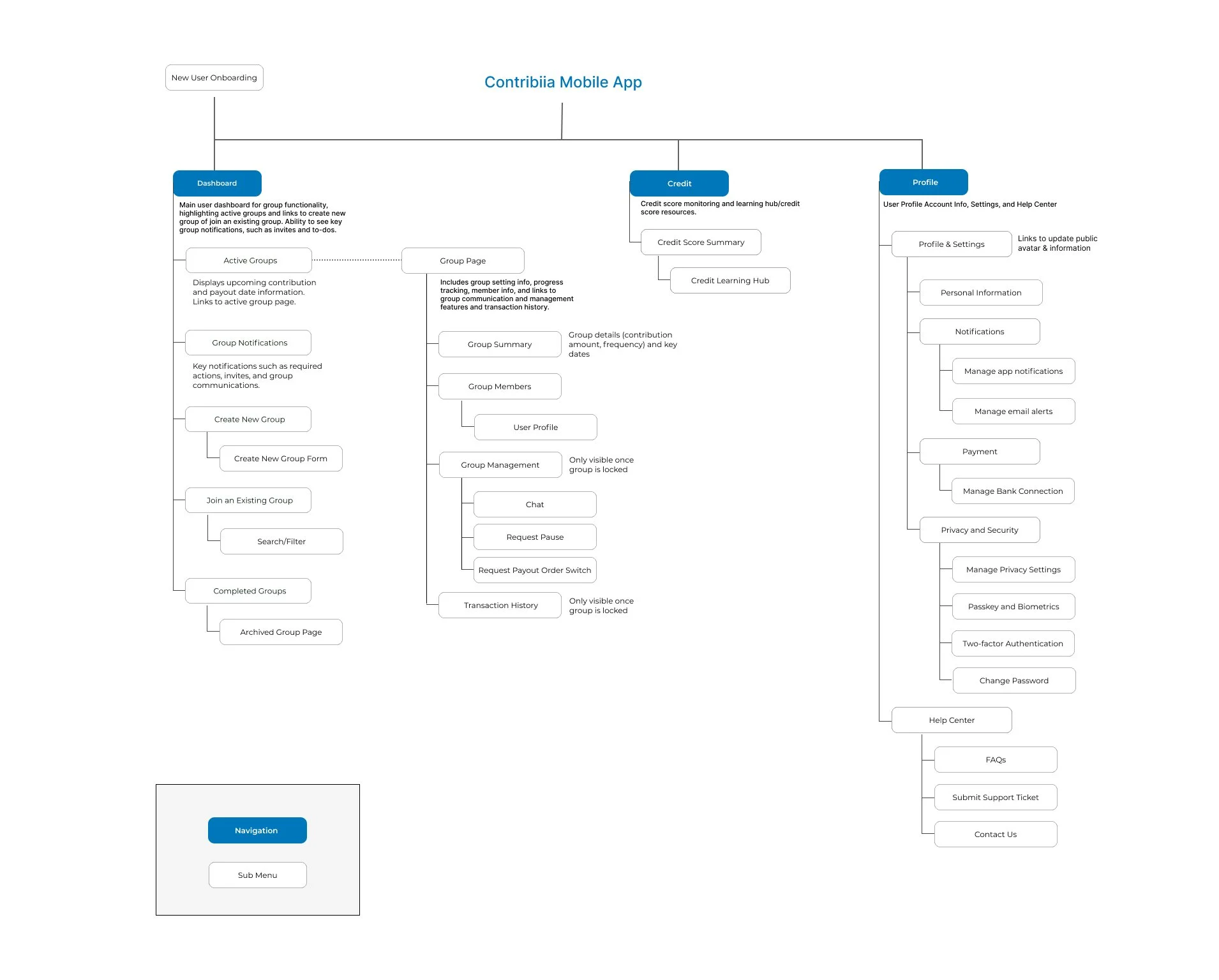 The sitemap creation process began with mapping out core user flows, features, and content areas—such as account management, support, group functionality, and credit-building tools. Initial drafts revealed redundancies and unnecessary complexity in navigation. Through several iterations, the sitemap was streamlined to eliminate overlap, reduce cognitive load, and prioritize high-frequency tasks.