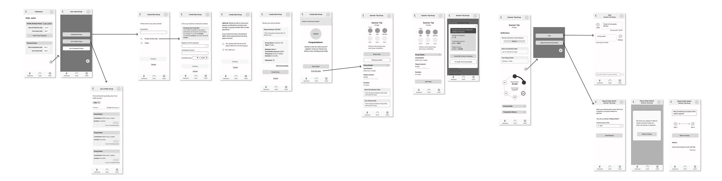 Our first round of usability testing with the mid-fidelity wireframes was illuminating. Users were very positive about the credit-building features, but still struggled with the concept of group savings and desired more support and transparency. Based on our mid-fidelity user tests, we identified a few key areas for improvement to prioritize in the next iteration: