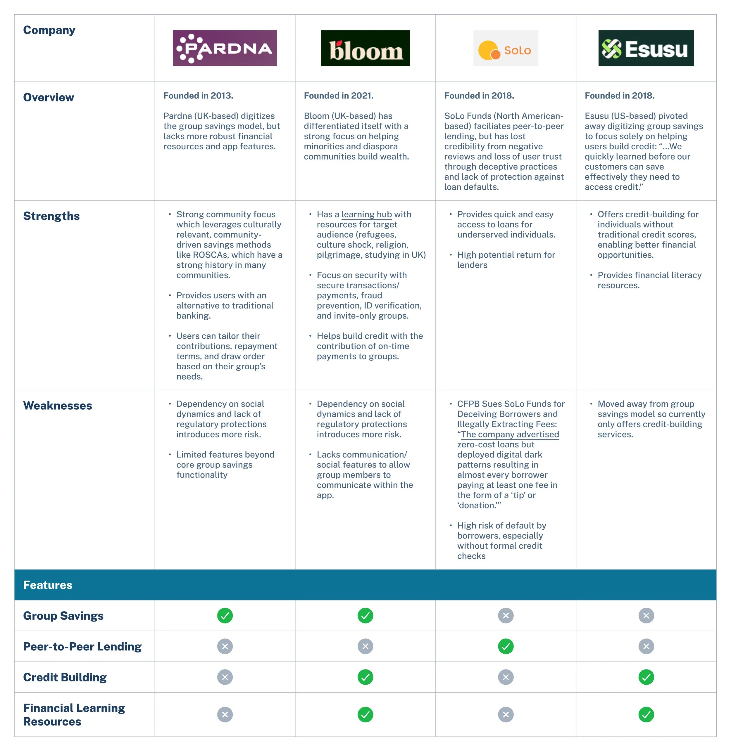 Target Audiences: Many existing platforms cater to regions like Africa and Latin America, where group savings is already culturally ingrained. These platforms aim to simplify the process for users already familiar with the concept. Additionally, some solutions focus on diaspora communities, addressing the lack of access to traditional credit systems for individuals living abroad.