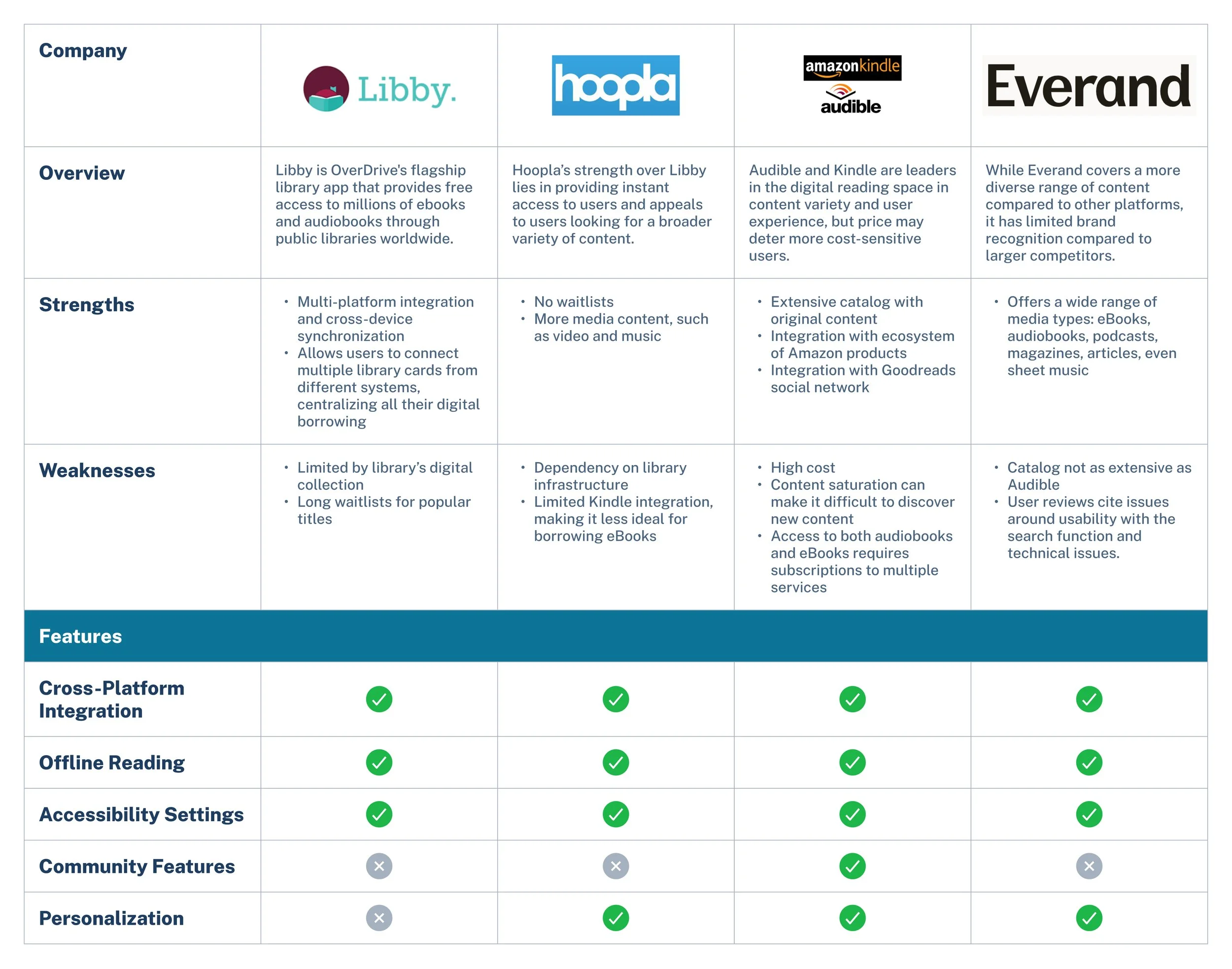To validate and deepen these insights, I also performed a competitive analysis of comparable digital reading platforms. This helped contextualize user expectations, assess strengths and shortcomings of existing solutions, and surface opportunities for innovation within Libby.