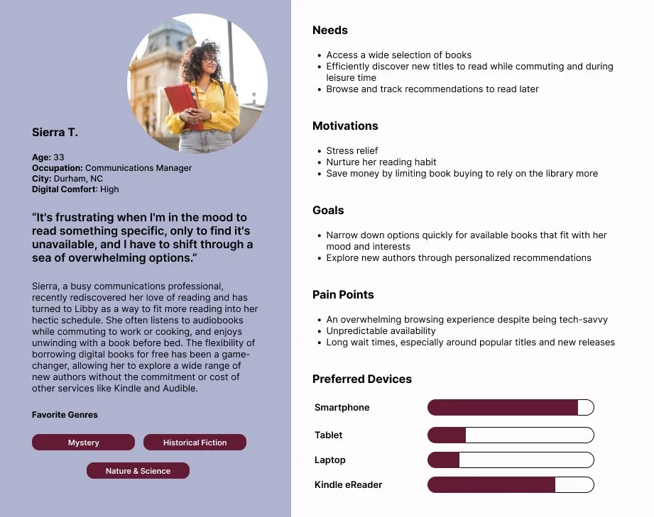 Based on my user research, I developed a working persona named Sierra to help define my target user and clarify the specific challenge I aimed to address within Libby. This foundation allowed me to set clear business and user goals: