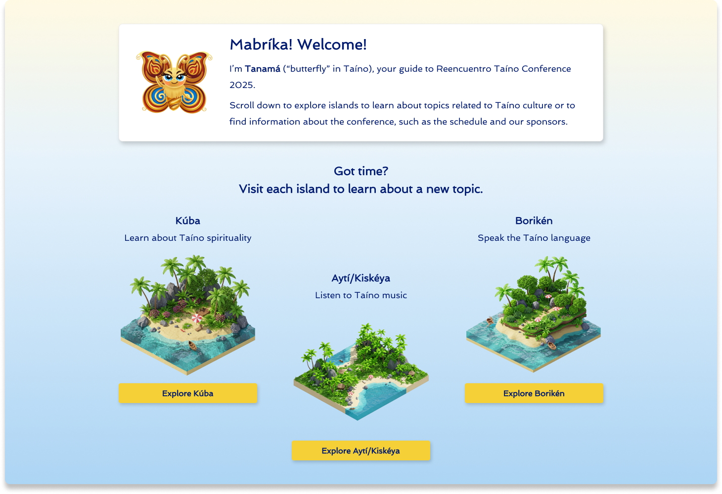 The client envisioned a conference mascot named Tanamá to guide visitors through the site, but the concept was open-ended. Working with the design team, we shaped Tanamá's image, personality, and voice to be empowering, lighthearted, and playful, additionally leveraging her to share fun facts about Taíno culture. Tanamá brought emotional resonance to the platform, while adding interactive moments throughout the experience.