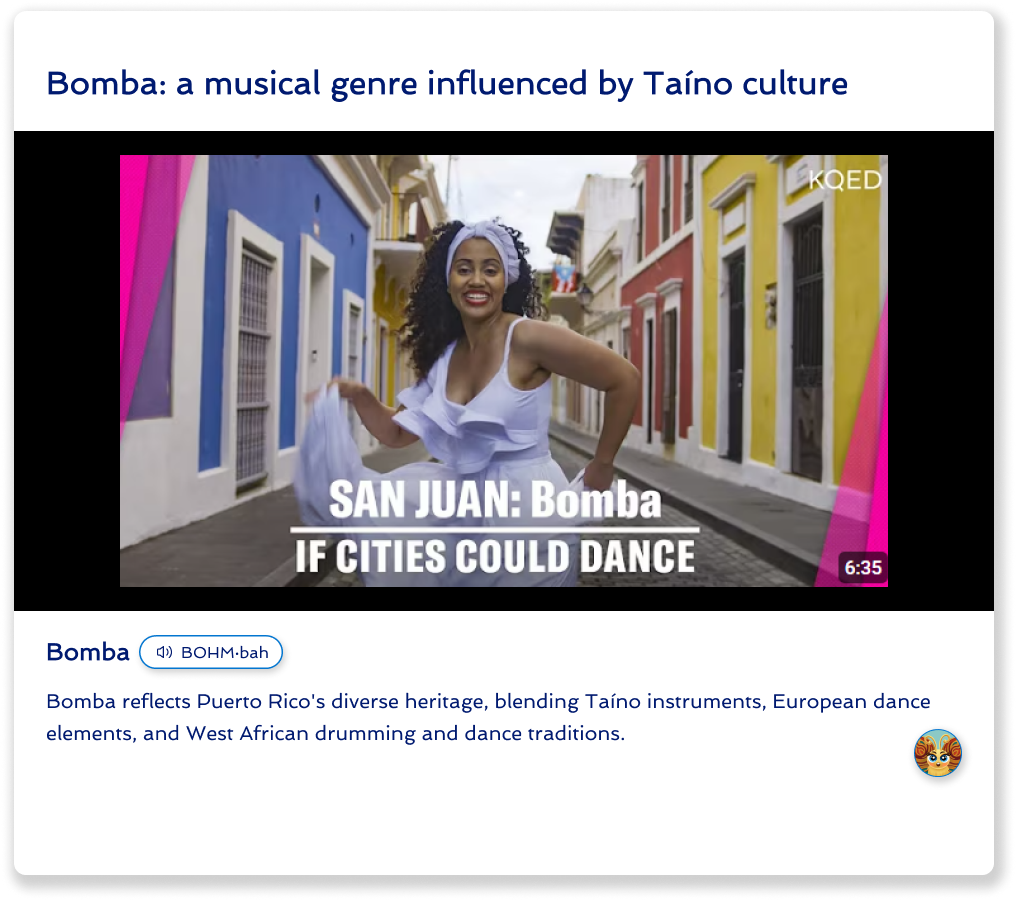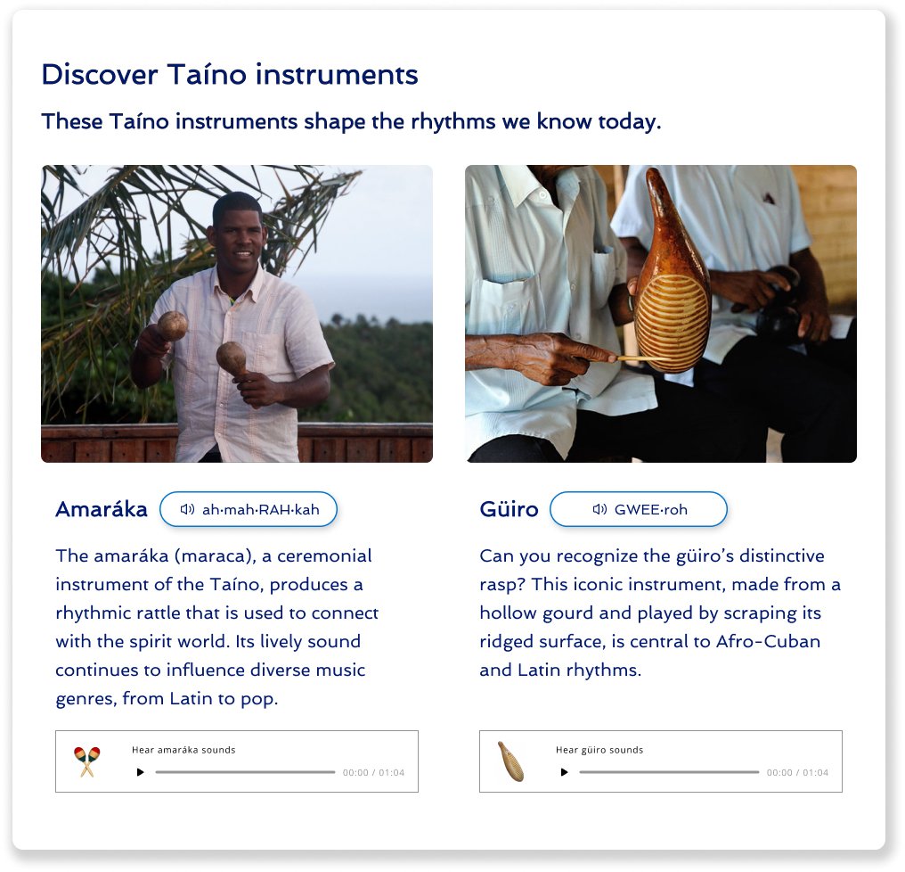 For the music experience specifically, I developed a narrative that connected historical Taíno music traditions to contemporary practices, creating interactive touchpoints that helped users understand how these traditions resonate today. With pronunciation guides, images of authentic instruments, and integrated audio and video players, visitors can experience the musical traditions in real-time.